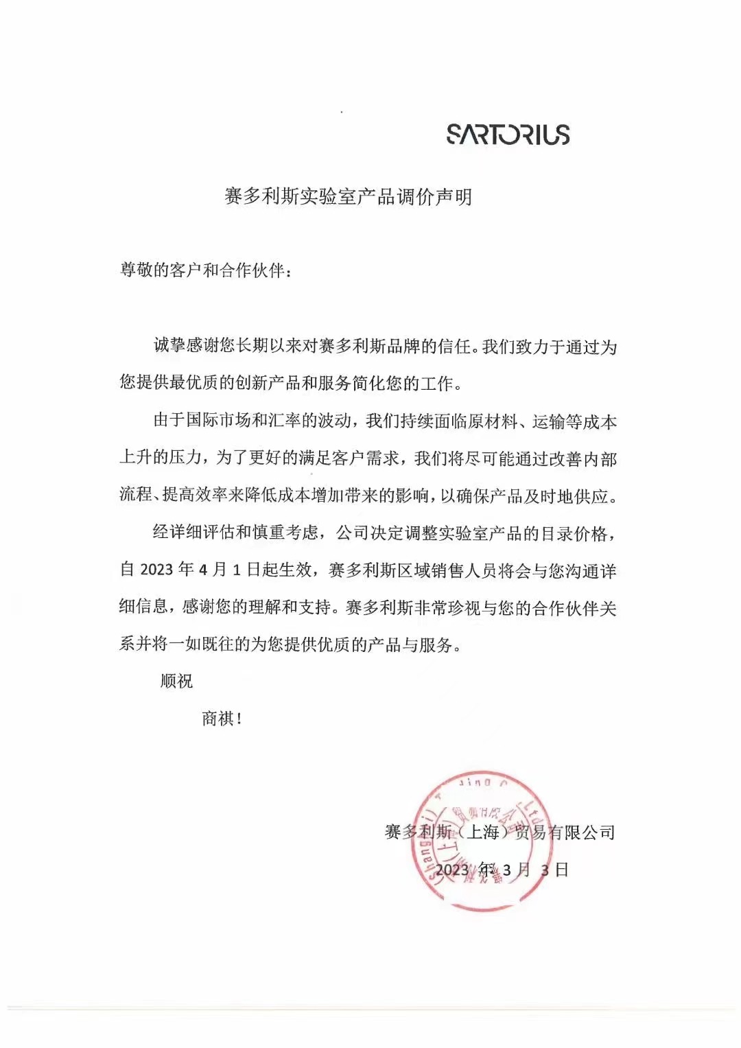 誠摯感謝您長期以來對賽多利斯品牌的信任。我們致力于通過為您提供最優質的創新產品和服務簡化您的工作。由于國際市場和匯率的波動,我們持續面臨原材料、運輸等成本上升的壓力,為了更好的滿足客戶需求,我們將盡可能通過改善內部流程、提高效率來降低成本增加帶來的影響,以確保產品及時地供應經詳細評估和慎重考慮,公司決定調整實驗室產品的目錄價格自2023年4月1日起生效,賽多利斯區域銷售人員將會與您溝通詳細信息,感謝您的理解和支持。賽多利斯非常珍視與您的合作伙伴關系并將一如既往的為您提供優質的產品與服務。順祝商祺!