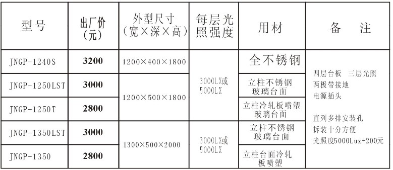 外形尺寸(長*寬*高):1200*500*1800; 每層光照強度:3000LX或5000LX; 用材:立柱不銹鋼,玻璃臺面。